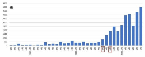 ロシアは、グラフ1にあるように急激に無人機攻撃回数を増加させている。2025年6月には約5000機に急増している。