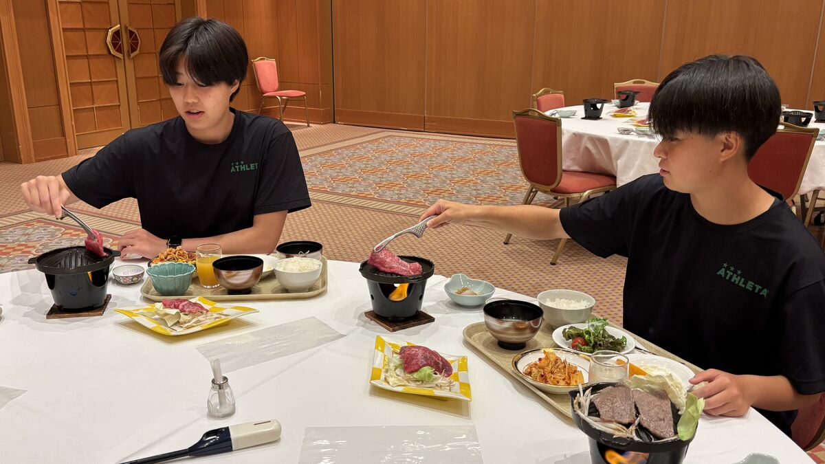 そんな疲れた選手たちがホテルに戻り、夕食会場で目にしたものは、素晴らしいお肉!
