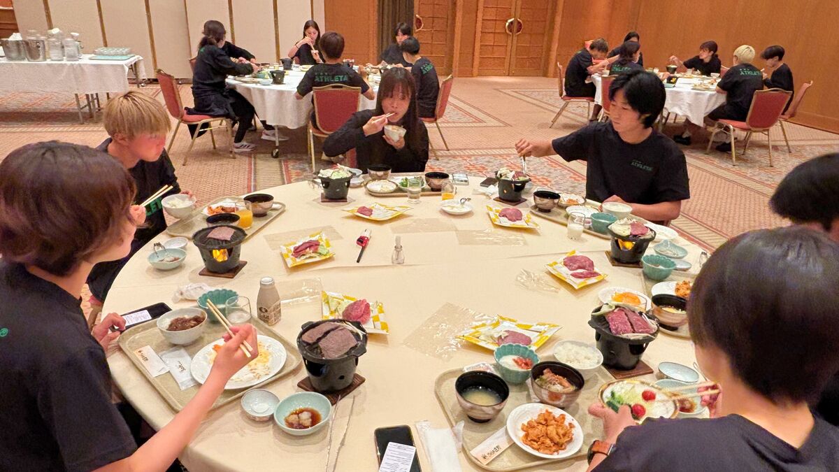 プレー中と同様に?真剣な表情でお肉を焼く選手たち。「美味し~い!!」という嬉しそうな声と笑顔、そしてお肉を焼く美味しそうな香りで食事会場のテンションは一気に上昇!まだまだ続くキャンプも頑張れそうです。