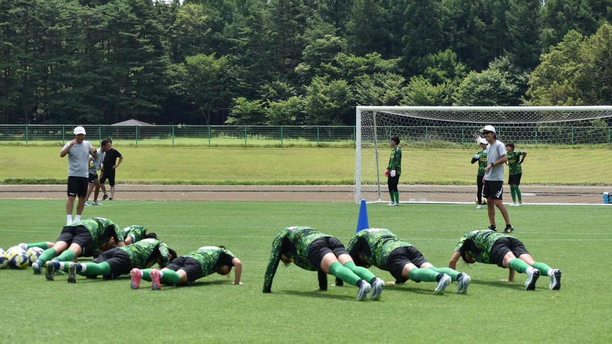 午前最後の練習は、DF陣とFW陣に分かれてトレーニング。FW陣のシュート練習がなかなか厳しい条件付きで、シュートがバーを越えるorGKにキャッチされると連帯責任で全員が腕立て伏せ。失敗した選手には「マジか~」と非難の声が、しっかり決めた選手には「ナイス!」と激励の声がかかり、チームメイトの放つシュートに全員が注目しコミュニケーションを深めていました。