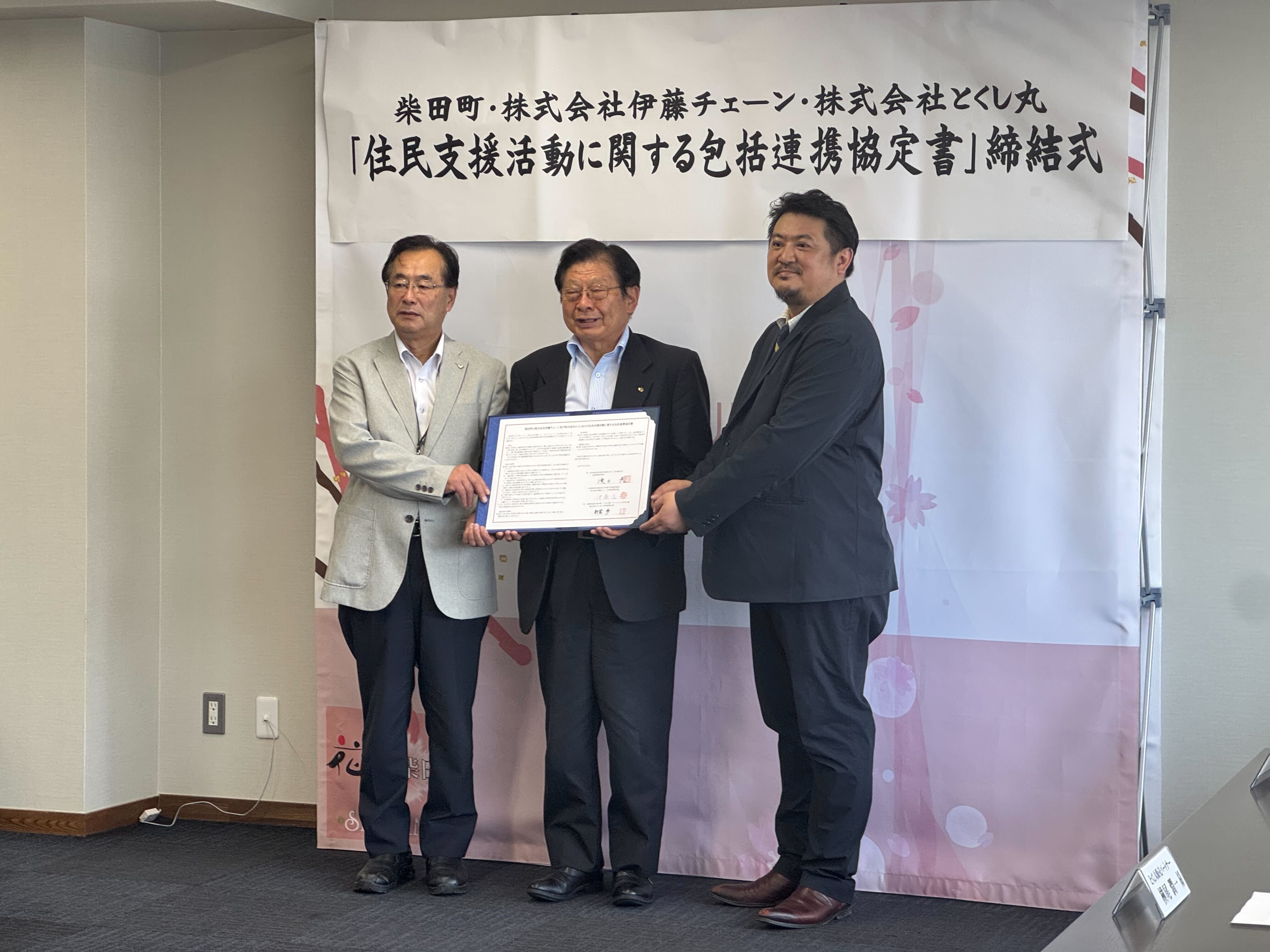 ▲とくし丸 見守り協定締結式の様子/伊藤チェーン 専務 伊藤氏(写真左)、柴田町 町長滝口氏(写真中央)、とくし丸 代表 新宮氏(写真右)