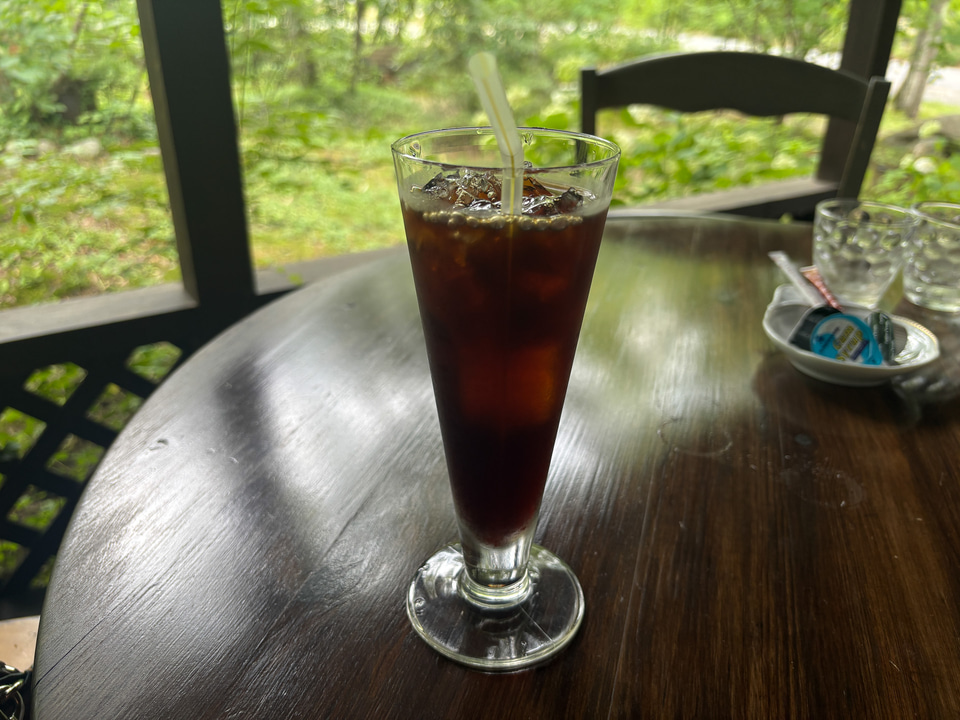 朝起きると夫がすでに焚き火を始めていて、またジンギスカンやらなにやら焼いていて軽く朝ごはんを食べお片付け。今回はタープのみの設営だったので、撤収もすごくスムーズでした。そして「せっかくだから森のカフェにも行きたいね」と話して、近くのカフェ「ティータイム ガルニ」へ。クラシック音楽が流れる落ち着いた空間で、この日も気温が高くなかったのでテラス席をチョイス。