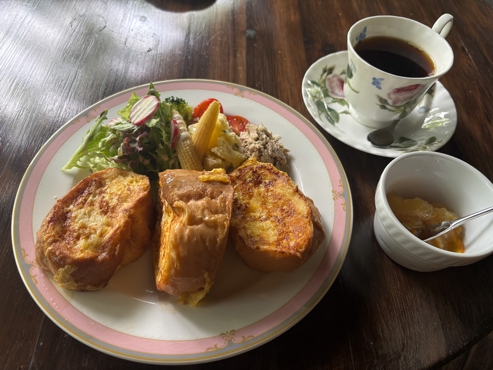 私はアイスコーヒー、夫は紅茶を注文し、気になったフレンチトーストも一緒にオーダーしてみました。これがまた中までしっかり卵液が染みていて、甘過ぎず、塩気もあるタイプ。朝ごはん感覚で食べられる味わいなのに、マーマレードジャムも添えられていて甘い方にもいけて甘い派・しょっぱい派、どちらも満足できるフレンチトーストでした。