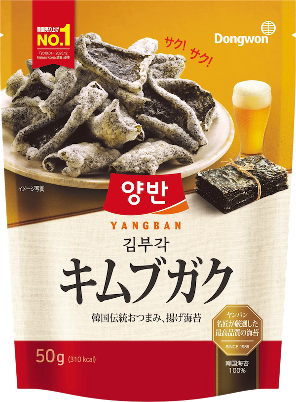 もち米を塗ったのりを軽く揚げた韓国の伝統的なおつまみ。ほどよい塩気と、サクッと軽やかな新食感がクセになる美味しさ。一度食べたら手が止まらない。濃いめの味つけが好きな人、そして何よりものりが好きな人にはたまらない逸品だろう。