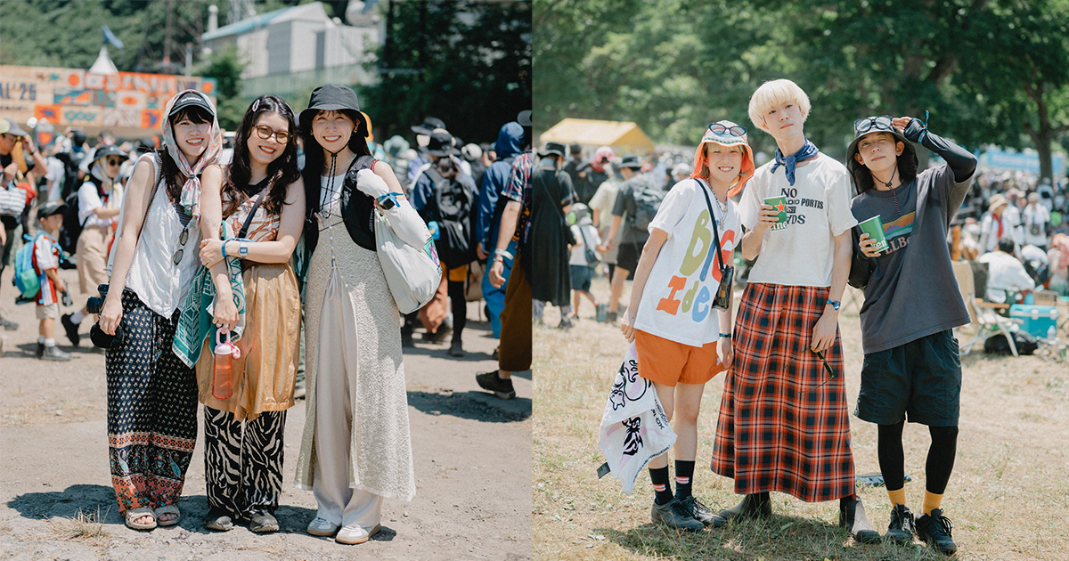 ファッションは初日に引き続きスカーフが強く支持されている模様。この人気は今後も続きそうだ。他にも独特な柄ものやワンピースが目立ち、中には今年の「フジロック」のテーマカラーを意識してコーディネートを組む人や、男性用スカートを着用する上級者も。足元は定番のトレッキングシューズのほか、水陸両用の「キーン」のサンダルを選ぶ人も散見し、これは会場に流れる川でも遊びやすいのもポイントだ。