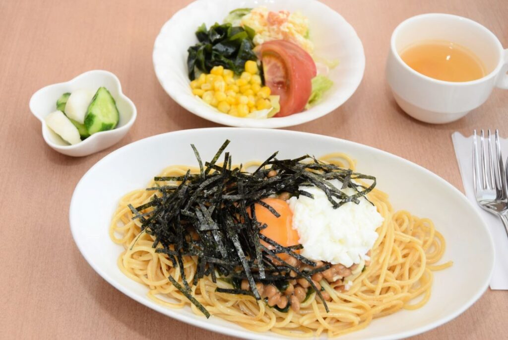 卵とたっぷりののりがさらにおいしさをプラス「納豆と卵スパゲッティー」