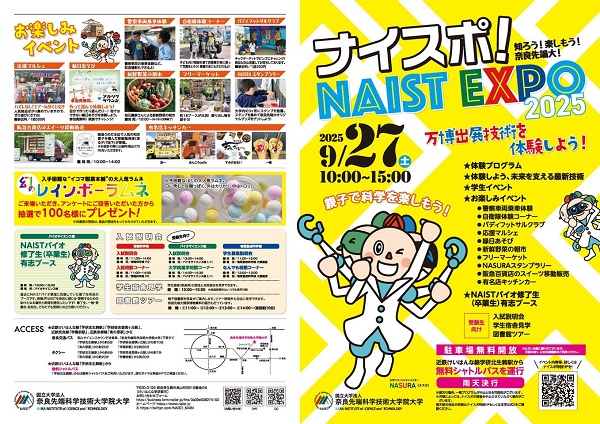 奈良先端科学技術大学院大学は、子供から大人まで広く一般市民を対象としたイベント「ナイスポ! NAIST EXPO 2025」を、9月27日(土)10:00~15:00(雨天決行)に開催する。