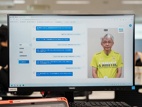 「ここ数年の生成AIの進化がなければ、モニター上でこれほどまでに精緻な会話を展開することはできなかったでしょう」と語る牛田准教授の指導のもと、「AIオンライン服薬指導システム」による第1回の授業がはじまりました。この授業の目的は、薬剤師役の学生が患者と会話しながら、在宅医療をはじめる患者の想いを確認し、最善の治療方針を立てることです。