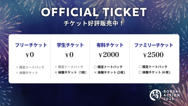 現在、PeatixやLivePocketにて、「BOUSAI ACTION 2025」のチケットを販売中。特典なしの「フリーチケット」の他、限定トートバックや体験券が付いた「有料チケット」2,000円、家族で利用できるお得な「ファミリーチケット」2,500円が用意されている。
