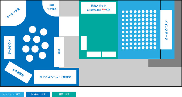 空き時間に遊びながら学ぶ「わいわいエリア」は、セッションの合間や、お昼休憩におすすめ。射的・スーパーボールすくい・かき氷などの縁日屋台(有料)、親子で楽しめるワークショップやクイズ、こども食堂(※)も展開される。