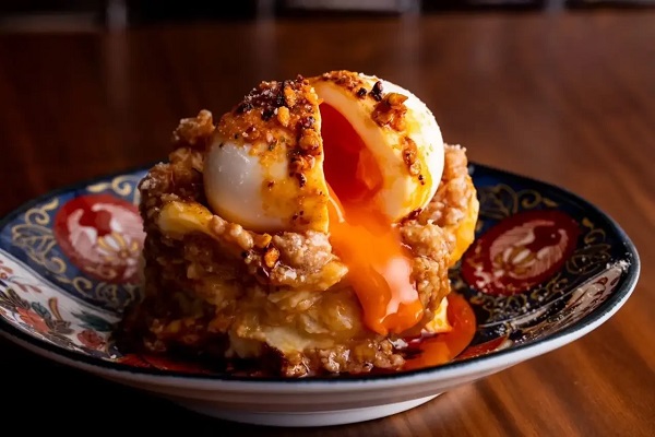 半熟卵をくずして絡めれば、まろやかさと濃厚さが広がる。