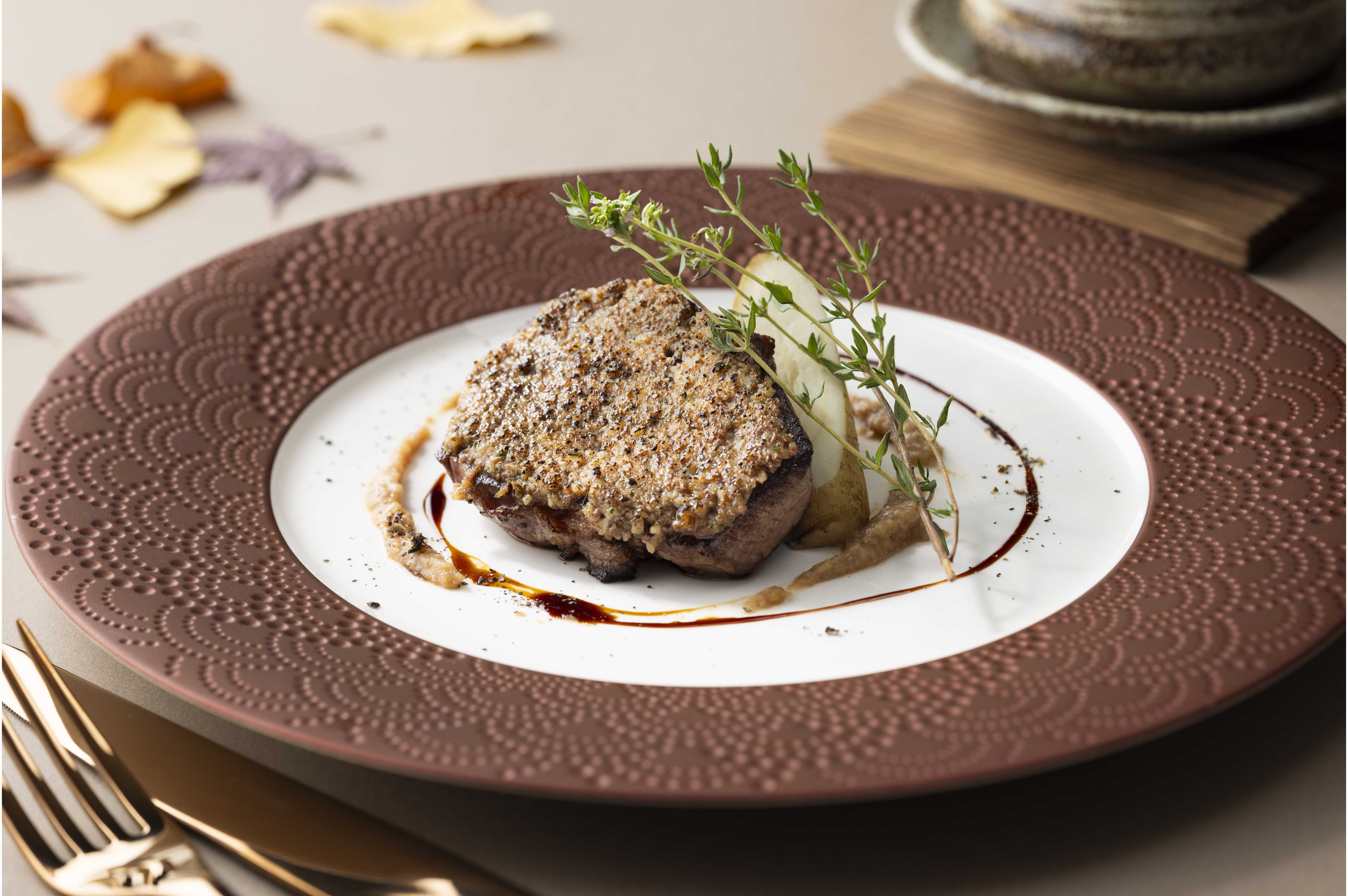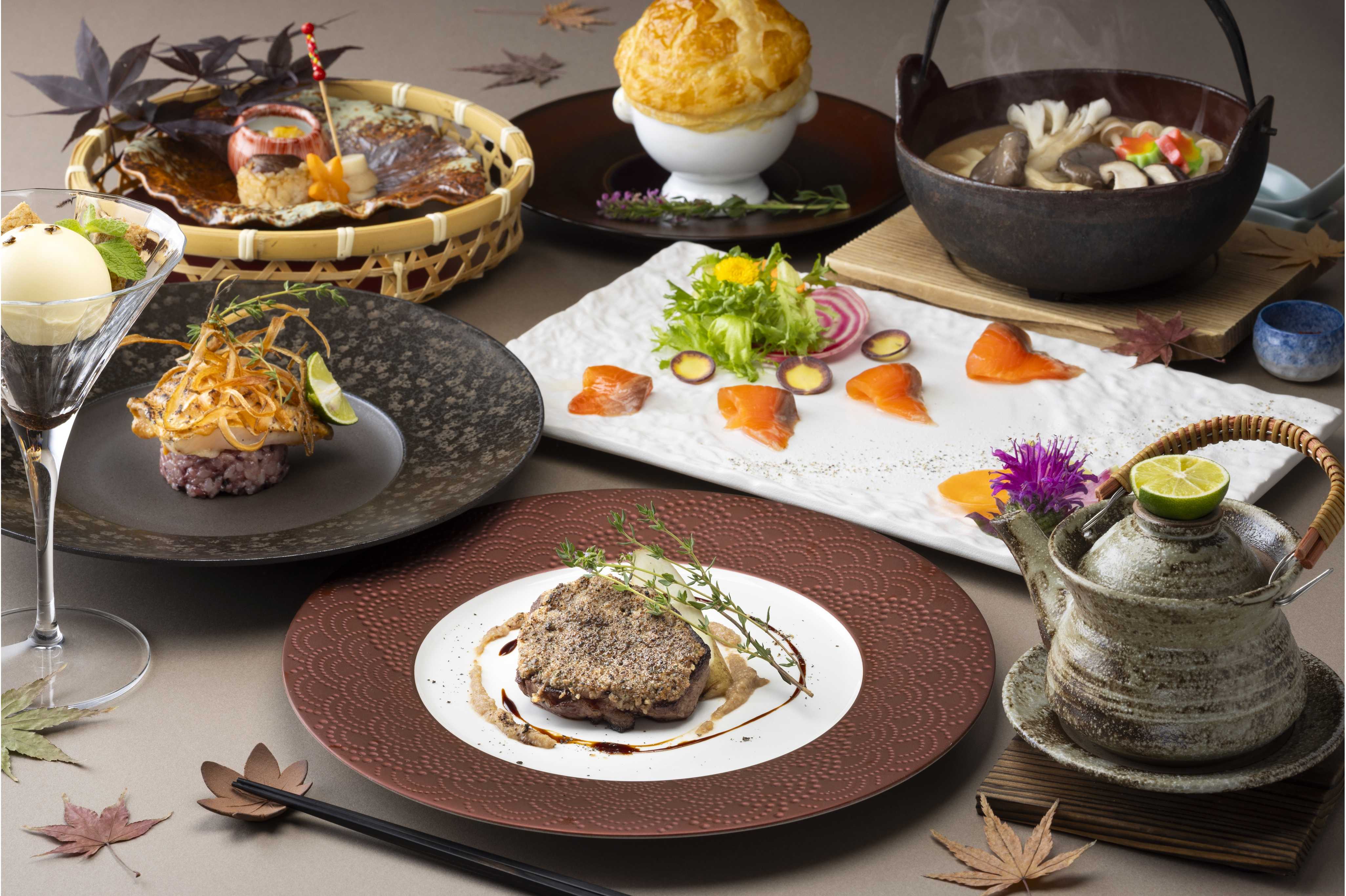 芳醇な香りを放つ茸が旬を迎える秋。今秋は、松茸やマッシュルーム、トリュフなど多彩な茸に、甲州ワインビーフや甲斐サーモンといった地元食材を融合させ、和と洋の技法を取り入れたディナーコースをご用意いたしました。コースの始まりは、松茸の土瓶蒸しをヒッコリーの燻香とともに閉じ込めた一品。蓋を開けた瞬間に広がる香りが秋の始まりを演出します。お造里は、昆布の旨味を纏った甲斐サーモンに香り高いトリュフ塩を合わせてご用意。メインディッシュの甲州ワインビーフテンダーロインのポアレは、マッシュルームとベーコンを被せて焼き上げ、江戸時代に甲斐国(山梨県)で生産されていた代表的な果物「甲州八珍果」を用いたピューレをソースとして添えました。お食事には、山梨の郷土料理「ほうとう鍋」を当ホテル風にアレンジ。地場の茸をふんだんに使用し、山梨県で生まれた伝統的な辛味調味料「すりだね」を添えることでお好みに応じて味の変化もお楽しみいただけます。食後のデザートは、トリュフハニーをかけたバニラアイスクリームで、香りの余韻を最後までお楽しみいただける一皿に仕立てました。