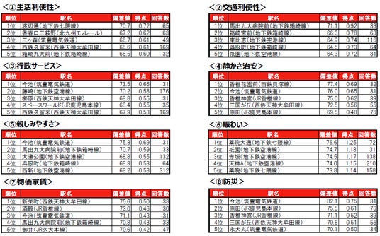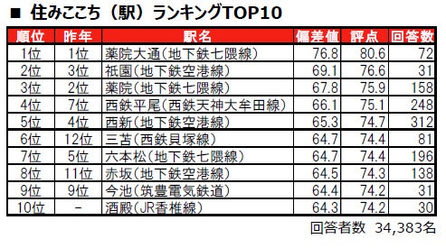 1位は6年連続で、福岡市中央区に位置する薬院大通(地下鉄七隈線)で、唯一偏差値70台の高い評価を得ています。2位は、福岡市博多区に位置する祇園(地下鉄空港線)、3位は福岡市中央区に位置する薬院(地下鉄七隈線)です。トップ10内では、糟屋郡粕屋町に位置する酒殿(JR香椎線)が、初登場で10位にランクインしています。酒殿は、昨年は累計回答者数が30名未満でランキングの集計対象外でした。