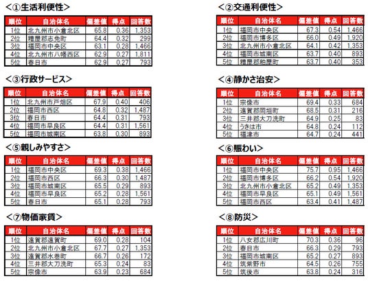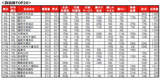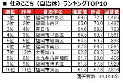福岡市中央区が、7年連続で1位に輝きました。2位は2年連続で福岡市西区、3位は昨年4位から順位を上げた春日市です。トップ10内では、大野城市が昨年12位から順位を上げて7位にランクインしています。