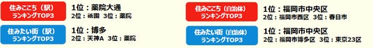 ※「住みたい街(駅)ランキング」は、福岡県居住者の2025年の回答を九州・沖縄エリアの駅を対象にしてランキングを集計しています。「住みたい街(自治体)ランキング」は、福岡県居住者の2025年の回答を全国の自治体を対象にしてランキングを集計しています。