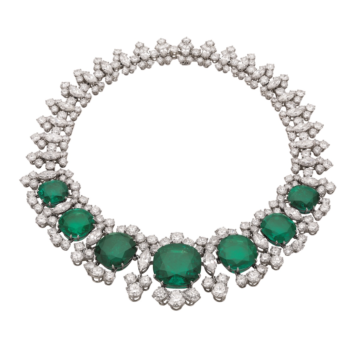 第2章“色彩の象徴性”では、色の文化的・象徴的な側面を掘り下げ、色彩の選択を通じてどのように意味や感情を伝えられるのかを考察する。注目作品は、10年前にも東京で展示された、プラチナにダイヤモンドと7つのエメラルドをあしらった“セブン・ワンダーズ”と呼ばれる“ネックレス”だ。