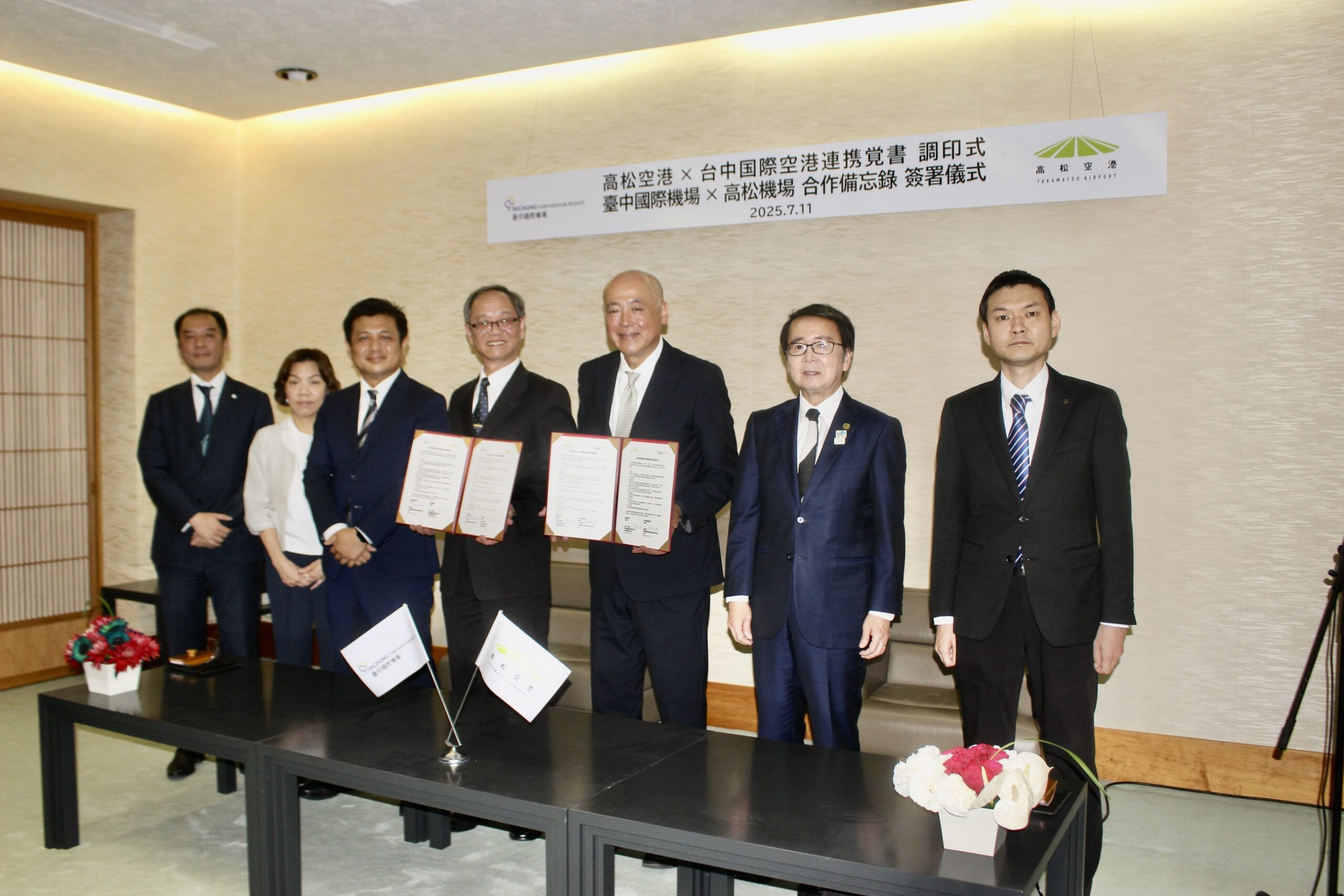 高松空港(株)(小幡義樹社長)と台湾交通部民用航空局 台中国際空港(張 瑞樹主任)は、7月11日に互いの航空輸送ネットワークをより緊密にし、路線振興及び両空港の周辺地域における交流拡大を目的とした連携覚書を締結した。
