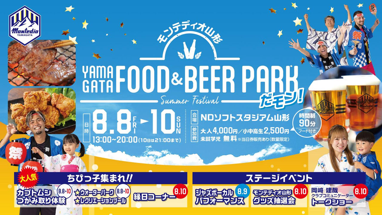 モンテディオ山形では、2025年8月8日(金)〜10日(日)の3日間、NDソフトスタジアム山形でビアガーデンイベント「YAMAGATA FOOD & BEER PARK だモン!」を開催します!