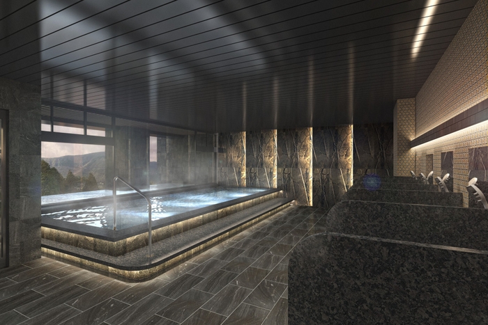 至福の温泉体験をご満喫いただくために、箱根の雄大な自然を一望できる大浴場を新設いたしました。モダンで清潔感あふれる空間には、広々とした内湯とサウナ、水風呂を完備。露天風呂からは空と森がとけ合うような絶景をお楽しみいただけます。
