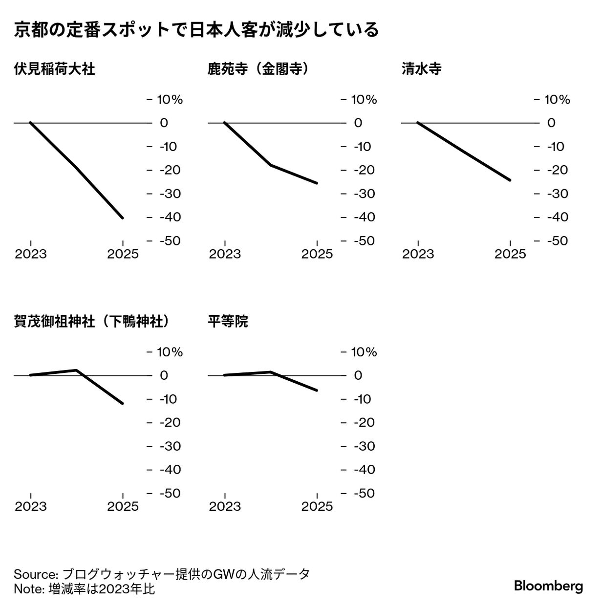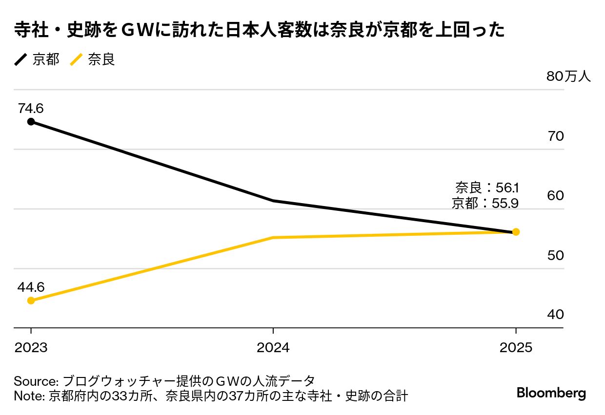 京都の著名な寺社から日本人観光客の足が遠のいている。今年のゴールデンウィーク(GW)に主な寺社や史跡を訪れた人出は、奈良が京都を上回っていた。混雑や宿泊費の高まりを避け、SNSを通じて広がる「穴場」にも人が集まっている。