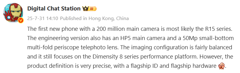 リーカーのDigital Chat Stationによれば、「Reno 15 Pro」にはSamsung製のHP5センサー(200MP)を搭載したメインカメラと、50MPのペリスコープ式望遠レンズが備わるとのこと。超広角カメラも存在するようですが、詳細は明かされていません。