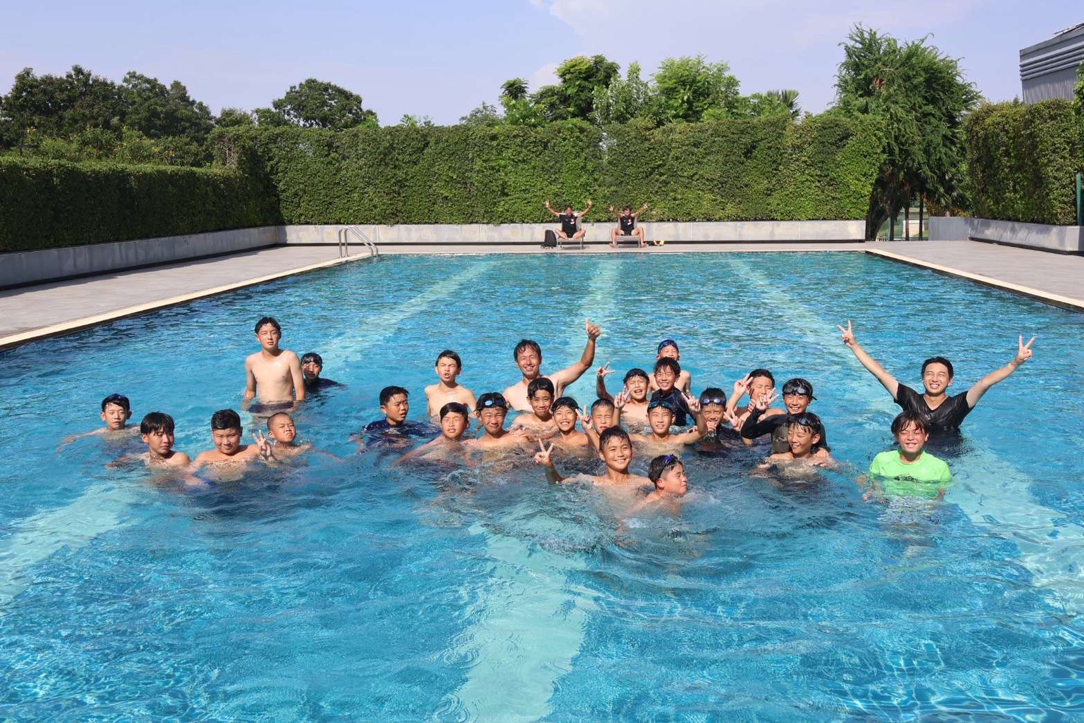 交流会を終えた後、選手たちはホテルに戻り、暑熱アプローチとしてホテル併設のプールへ。気温の高い日中の活動を終えた身体をクールダウンさせ、リフレッシュした様子でした。
